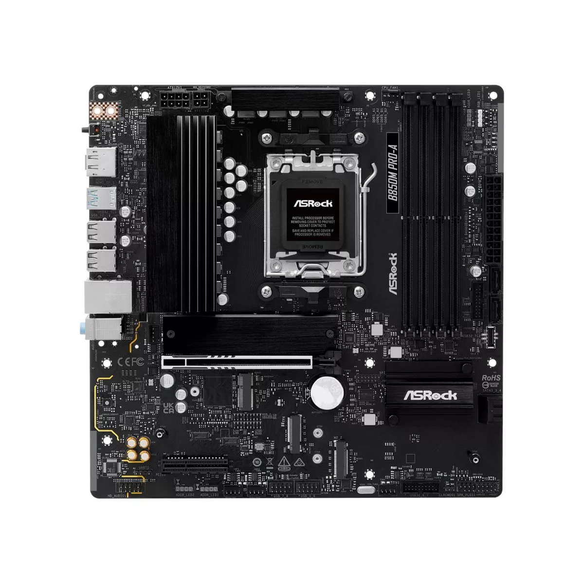 Marca Asrock Part Number B850M PRO-A 90-MXBR80-A0UAYAZ CPU - Soporta AMD Socket AM5 Ryzen™ 9000, 8000 y 7000 Series Processors* Chipset AMD B850 Memoria - Dual Channel DDR5 Memory Technology - 4 x DDR5 ranuras DIMM - Máxima capacidad de memoria del sistema: 256GB Gráficos Integrated AMD RDNA™ graphics (El soporte actual puede variar según la CPU) - 1 x HDMI 2.1 TMDS/FRL Compatible con 8G, Soporta HDR, HDCP 2.3 y max. Resolución up to 4K 120Hz - 1 x DisplayPort 1.4 con DSC (comprimido), Soporta HDCP 2.3 y max. Resolución up to 4K 120Hz Audio - Audio 7.1 canales HD (Realtek ALC897 Audio Codec) LAN - 2.5 Gigabit LAN 10/100/1000/2500 Mb/s - Dragon RTL8125BG - Soporta Dragon 2.5G LAN Software - Control de ancho de banda inteligente de ajuste automatico Conectores - 1 x cabecera SPI TPM - 1 x LED de alimentación y header de altavóz - 1 x Encabezado RGB LED* - 3 x Encabezado LED direccionable** - 2 x conectores ventilador Procesador (4-pin) (Control de velocidad ventilador Smart Fan)*** - 3 x conectores ventilador caja (4-pin) (Control de velocidad ventilador Smart Fan)*** - 1 x conector alimentación 24 pin ATX - 1 x conector alimentación 8 pin 12V (Conector de Alimentación de Alta Densidad) - 1 x conector alimentación 4 pin 12V (Conector de Alimentación de Alta Densidad) - 1 x Conector panel frontal audio - 2 x cabezales USB 2.0 (soporta 4 puertos USB 2.0) - 2 x cabezales USB 3.2 Gen1 (soporta 4 puertos USB 3.2 Gen1) - 1 x Panel Frontal Tipo C USB 3.2 Gen1 Encabezado Panel trasero E/S - 2 x Puntos de montaje de la antenna - 1 x puerto HDMI - 1 x DisplayPort 1.4 - 1 x puerto USB 3.2 Gen2 Type-A (10 Gb/s) - 1 x puerto USB 3.2 Gen2 Type-C - 2 x puertos USB 3.2 Gen1 - 4 x puertos USB 2.0 - 1 x Puerto RJ-45 - 1 x Interruptor Flashback del BIOS - Conectores HD Audio: entrada de línea / Altavoz Delantero / Micrófono Formato Micro ATX Form Factor (24.4 cm x 24.4 cm) RAID Soporta RAID 0, RAID 1 y RAID 10 para dispositivos de almacenamiento SATA y M.2 NVMe.
