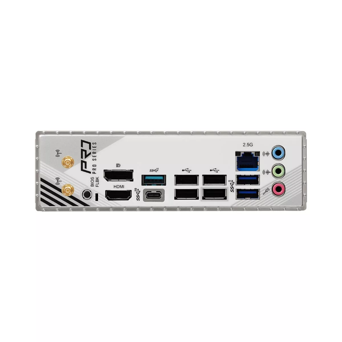 | Panel trasero E/S | - 2 x Puertos de antena - 1 x puerto HDMI - 1 x DisplayPort 1.4 - 1 x puerto USB 3.2 Gen2 Type-A (10 Gb/s) - 1 x puerto USB 3.2 Gen2 Type-C - 2 x puertos USB 3.2 Gen1 - 4 x puertos USB 2.0 - 1 x Puerto RJ-45 |