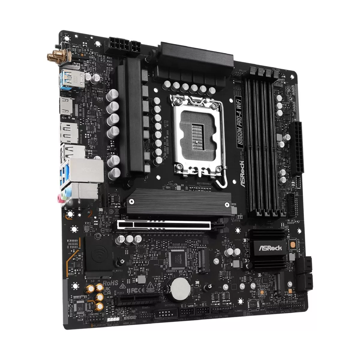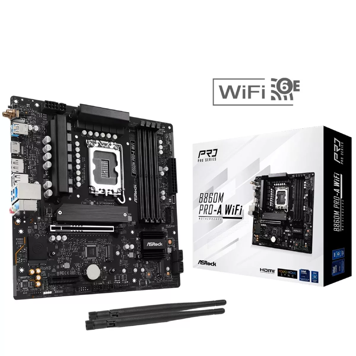 Marca Asrock Part Number B860M PRO-A WIFI 90-MXBRS0-A0UAYAZ CPU Soporta Intel® Core™ Ultra Processors (Series 2) (LGA1851), Soporta Intel® Hybrid Technology, Soporta Intel® Turbo Boost Max 3.0 Technology, Soporta Intel® Aumento de velocidad térmica (TVB). Chipset Intel® B860 Memoria Dual Channel DDR5 Memory Technology, 4 x DDR5 ranuras DIMM, Soporta memoria DDR5 non-ECC, un-buffered hasta 8666+(OC)*, Soporta Clocked Unbuffered DIMM (CUDIMM), Máxima capacidad de memoria del sistema: 256GB, Soporta Intel® Extreme Memory Profile (XMP) 3.0x. BIOS 256Mb AMI UEFI Legal BIOS con soporte GUI, Interruptor Flashback del BIOS, Instalador de drivers ASRock automático, Solucionador de problemas EZ, ASRock Mensaje de estado Checker, ASRock Flash instantáneo. Gráficos Intel® Xe LPG Arquitectura gráfica. 1 x HDMI 2.1 compatible con 8G (HDR, HDCP 2.3), resolución hasta 4K 120Hz. 1 x DisplayPort 1.4 con DSC (HDCP 2.3), resolución hasta 8K 60Hz/5K 120Hz. Audio Audio 7.1 canales HD (Realtek ALC897 Audio Codec) LAN 2.5 Gigabit LAN 10/100/1000/2500 Mb/s (Dragon RTL8125BG), Wi-Fi 6E (802.11axe, Dual-Band 2x2, 6GHz band), Bluetooth 5.3. Ranuras de Expansión 1 x PCIe 5.0 x16 Slot (PCIE1), 1 x PCIe 4.0 x4 Slot (PCIE2), 1 x Socket M.2 (Key E) para módulo WiFi/BT PCIe tipo 2230. Conectores 1 x cabecera SPI TPM, 1 x LED de alimentación y header de altavóz, 1 x Encabezado RGB LED, 3 x Encabezado LED direccionable, 2 x conector ventilador Procesador (4-pin), 3 x conectores ventilador caja (4-pin), 1 x AIO Pump Fan Connector (4-pin), 1 x conector alimentación 24 pin ATX, 1 x conector alimentación 8 pin 12V, 1 x conector alimentación 4 pin 12V, 1 x Conector panel frontal audio, 2 x cabezales USB 2.0 (4 puertos), 1 x cabezal USB 3.2 Gen1 (2 puertos), 1 x Panel Frontal Tipo C USB 3.2 Gen1 Encabezado. Panel trasero E/S 2 x Puertos de antena, 1 x puerto HDMI, 1 x DisplayPort 1.4, 1 x USB 3.2 Gen2x2 Type-C (20 Gb/s), 3 x puertos USB 3.2 Gen1, 2 x puertos USB 2.0, 1 x Puerto RJ-45, 1 x Interruptor Flashback del BIOS, Conectores HD Audio (entrada de línea / Altavoz Delantero / Micrófono). Caract. Especiales Productividad sin igual: PCIe Gen5 (Graphics, M.2), Dual Channel DDR5. Duro y sólido como la roca: 10+1+1+1+1 Power Phase, Dr.MOS. Conectividad ultra rápida: 2.5G LAN, 802.11axe Wi-Fi 6E Module. Actualizador EZ: Interruptor Flashback del BIOS, Instalador de drivers ASRock automático, Solucionador de problemas EZ, ASRock Mensaje de estado Checker. Soporta Intel® Volume Management Device (Intel® VMD). ASRock Polychrome SYNC. Accesorios 1 x I/O Shield, 2 x cables de datos SATA, 2 x Antenas WiFi ASRock 2.4/5/6 GHz. Formato Micro ATX Form Factor: 9.6-in x 9.6-in, 24.4 cm x 24.4 cm Certificaciones FCC, CE, ErP/EuP ready (ErP/EuP ready power supply is required) Socket LGA1851 Almacenamiento 1 x Blazing Socket M.2 (M2_1, Key M) PCIe Gen5x4 (128 Gb/s), 1 x Hyper Socket M.2 (M2_2, Key M) PCIe Gen4x4 (64 Gb/s), 1 x Hyper Socket M.2 (M2_3, Key M) PCIe Gen4x4 (64 Gb/s), 4 x conectores SATA3 de 6.0 Gb/s. Soporta NVMe SSD como discos de arranque. Soporta Dispositivo de administración de volumen Intel® (Intel® Volume Management Device - VMD). RAID Soporta USB Total puertos: 1x USB 3.2 Gen2x2 Type-C (Trasero), 1x USB 3.2 Gen1 Type-C (Cabezal Frontal), 5x USB 3.2 Gen1 Type-A (3 Traseros, 2 Cabezales Frontales), 6x USB 2.0 (2 Traseros, 4 Cabezales Frontales). Todos los puertos USB admiten protección ESD.