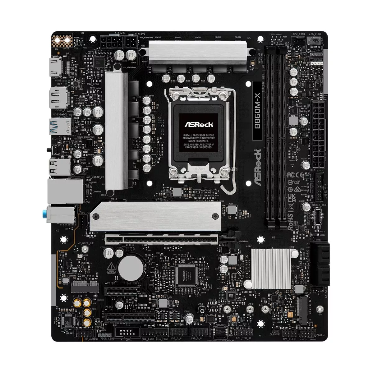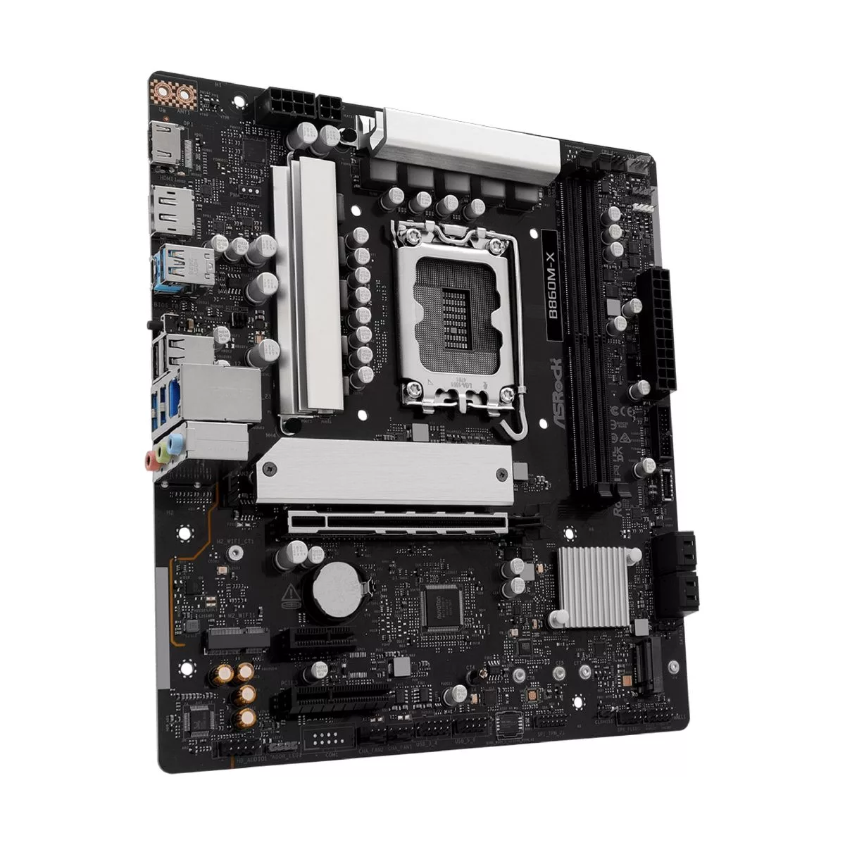 Marca Asrock Part Number B860M-X 90-MXBRX0-A0UAYAZ CPU Soporta Intel® Core™ Ultra Processors (Series 2) (LGA1851), Intel® Hybrid Technology, Intel® Turbo Boost Max 3.0 Technology, Intel® Aumento de velocidad térmica (TVB), Intel® Tecnología de impulso adaptativo (ABT), NPU integrada para aceleración de IA dedicada. Chipset Intel® B860 Memoria Tecnología de memoria Dual Channel DDR5. 2 x ranuras DIMM. Soporta DDR5 non-ECC, un-buffered hasta 9066+(OC) MHz. Soporta Clocked Unbuffered DIMM (CUDIMM). Máxima capacidad de memoria del sistema: 128GB. Soporta Intel® Extreme Memory Profile (XMP) 3.0x. BIOS 256Mb AMI UEFI Legal BIOS con soporte GUI. Soporta 'Plug and Play', ACPI 5.1, Jumperfree, SMBIOS 2.3, Ajuste múltiple de voltaje DRAM. Incluye ASRock Flash Instantáneo, BIOS Flashback. Gráficos Intel® Xe LPG Arquitectura gráfica. Salidas: 1 x HDMI 2.1 (Soporta HDR, HDCP 2.3, Resolución hasta 4K 120Hz), 1 x DisplayPort 1.4 con DSC (comprimido) (Soporta HDCP 2.3, Resolución hasta 8K 60Hz/5K 120Hz). *Requiere procesador con gráficos integrados. Audio Audio 7.1 canales HD (Realtek ALC897 Audio Codec) LAN 2.5 Gigabit LAN 10/100/1000/2500 Mb/s (Dragon RTL8125BG). Soporta Wake-On-LAN, Protección Lightning/ESD, Energy Efficient Ethernet 802.3az, PXE. Incluye Dragon 2.5G LAN Software con control de ancho de banda inteligente. Conectores 1 x Cabecera SPI TPM. 1 x LED de alimentación y altavoz. 1 x Encabezado RGB LED (12V/3A). 2 x Encabezados LED direccionables (5V/3A). 2 x Conectores ventilador CPU (4-pin). 2 x Conectores ventilador caja (4-pin). 1 x Conector AIO Pump Fan (4-pin). 1 x Conector alimentación 24 pin ATX. 1 x Conector alimentación 8 pin 12V. 1 x Conector alimentación 4 pin 12V. 1 x Conector panel frontal audio. 2 x Cabezales USB 2.0 (4 puertos). 1 x Cabezal USB 3.2 Gen1 (2 puertos). 1 x Panel Frontal Tipo C USB 3.2 Gen1 Encabezado. Panel trasero E/S 2 x Puntos de montaje de antena. 1 x Puerto HDMI. 1 x DisplayPort 1.4. 1 x USB 3.2 Gen2x2 Type-C (20 Gb/s). 3 x Puertos USB 3.2 Gen1. 2 x Puertos USB 2.0. 1 x Puerto RJ-45. 1 x Interruptor Flashback del BIOS. Conectores HD Audio (Entrada de línea / Altavoz Delantero / Micrófono). Accesorios 1 x I/O Shield. 2 x cables de datos SATA. 2 x Tornillos para Sockets M.2. 1 x Separador para el zócalo M.2. Formato Micro ATX: 9.6-in x 8.6-in (24.4 cm x 21.8 cm) Socket LGA1851 Almacenamiento CPU: 1 x Blazing Socket M.2 (M2_1, Key M) compatible con PCIe Gen5x4 (128 Gb/s) (tipos 2260/2280). Chipset: 1 x Hyper Socket M.2 (M2_2, Key M) compatible con PCIe Gen4x4 (64 Gb/s) (tipos 2230/2242/2260/2280). 4 x conectores SATA3 de 6.0 Gb/s. RAID Soporta
