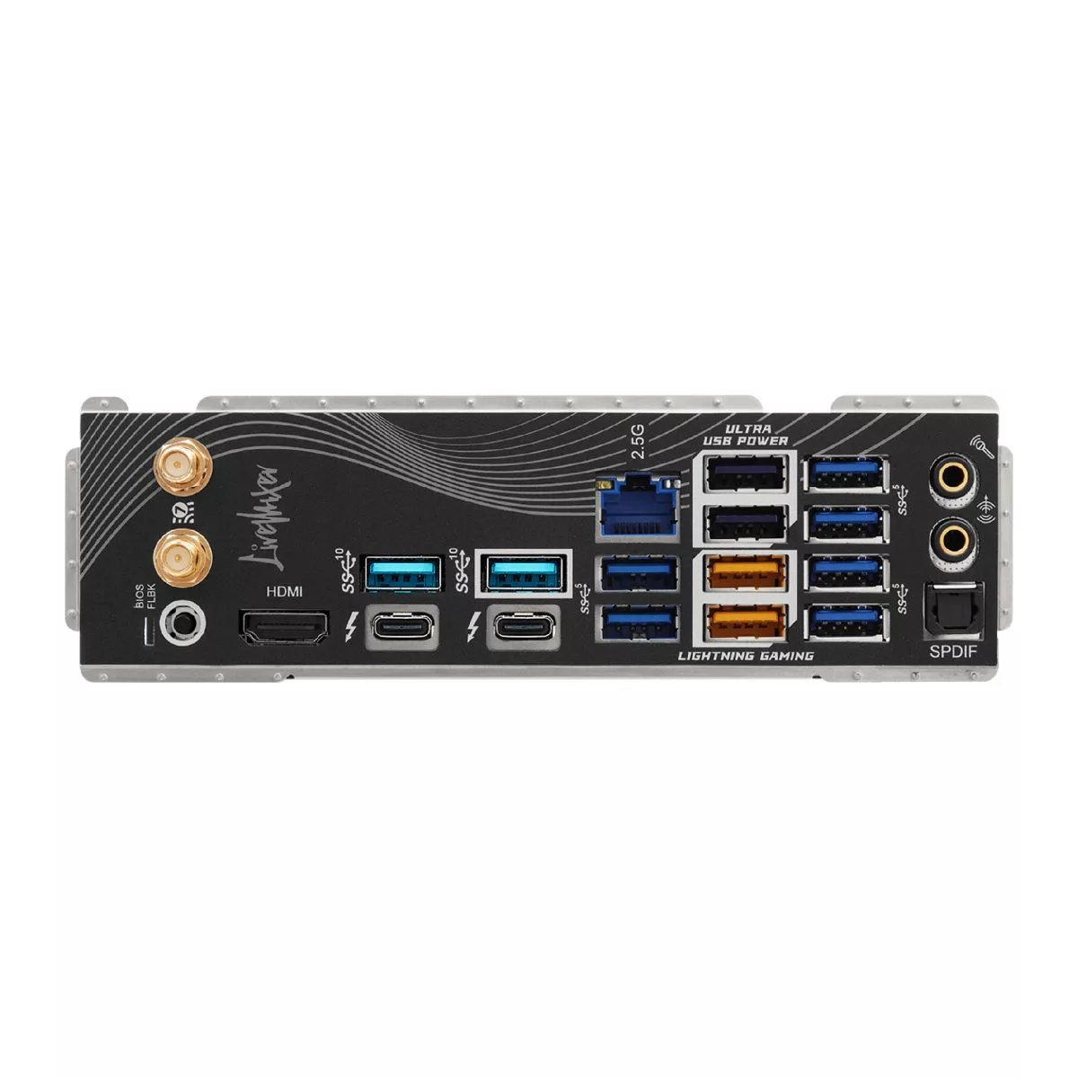 | Panel trasero E/S | - 2 x Puertos de antena - 1 x puerto HDMI - 1 x Puerto de salida Óptico SPDIF - 2 x Thunderbolt™ 4/USB4 Type-C Ports (40 Gb/s)* - 2 x puertos USB 3.2 Gen2 Type-A (10 Gb/s) - 10 x puertos USB 3.2 Gen1** - 1 x Puerto RJ-45 - 1 x Interruptor Flashback del BIOS - 1 x Línea de salida Jack (Gold Audio Jack) - 1 x Línea de entrada de micrófono Jack (Gold Audio Jack) |