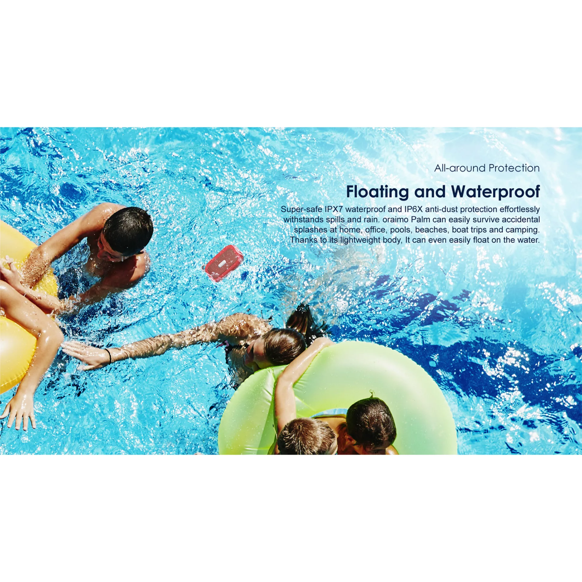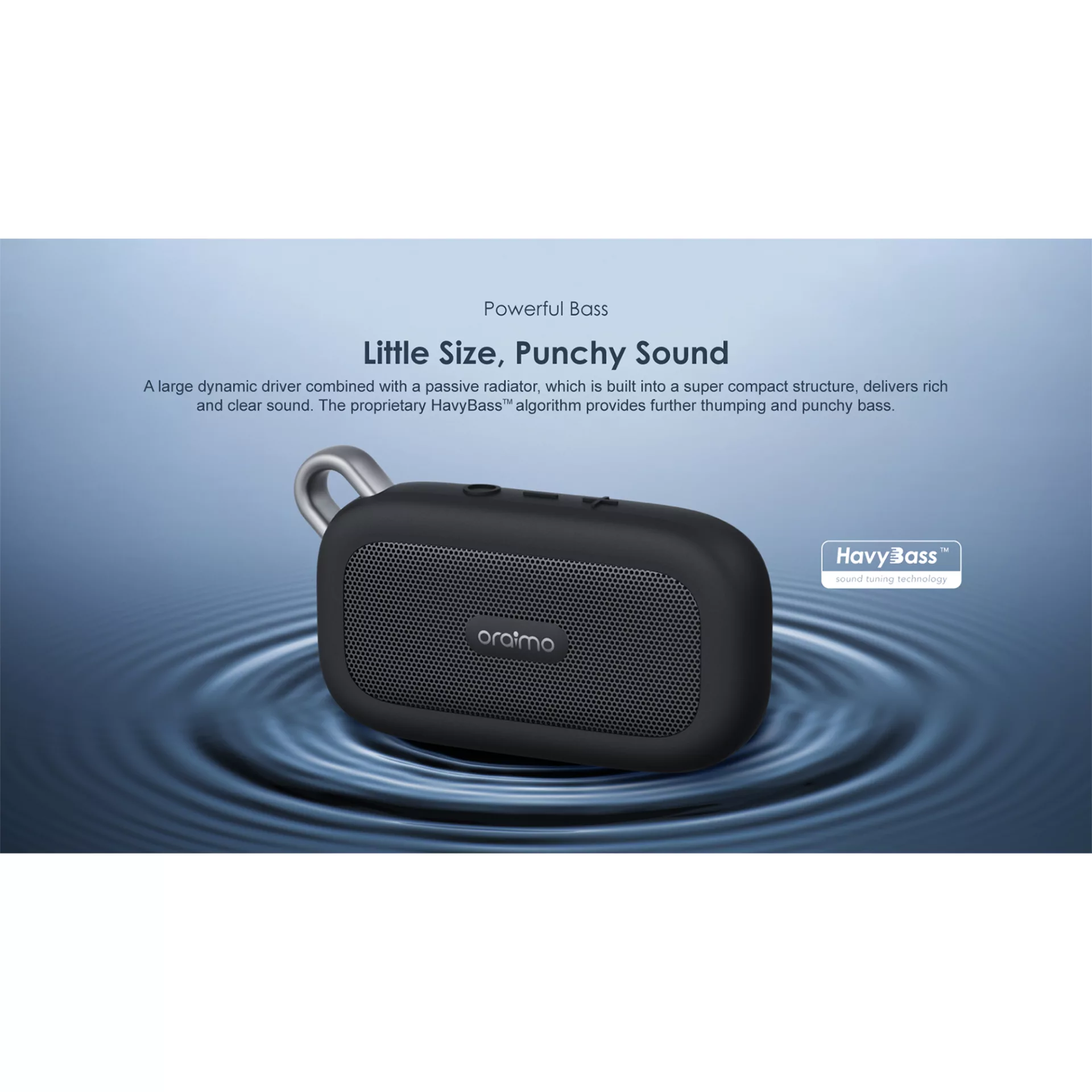 ORAIMO - PARLANTE INALÁMBRICOPALMOBS-04SPARLANTE PORTÁTIL INALÁMBRICO BLUETOOTH.Tamaño pequeño, sonido contundente.Un gran controlador dinámico combinado con un radiador pasivo, que está integrado en una estructura súper compacta, brinda un sonido rico y claro. El algoritmo patentado HavyBass proporciona graves más potentes y contundentes.Certificación: IP67, a prueba de polvo y agua, resiste derrames y lluvia.Oraimo Palm puede sobrevivir fácilmente a salpicaduras accidentales en el hogar, la oficina, piscinas, playas, viajes en bote y campamentos. Incluso en caso de caídas accidentales al agua gracias a su cuerpo liviano, puede flotar fácilmente.Conectividad: BLUETOOTH 5.0.Alcance BLUETOOH: 10 m.Salida de Altavoz: 3 W.Puertos: 3,5 mm x 1.Gancho para adjuntar a mochila o similar.Batería: 400 mAh.Tiempo de Reproducción: 5 h APROX.Color: GRIS.Link del Fabricante.Garantía: 1 año.Contra Defecto de Fabricación.