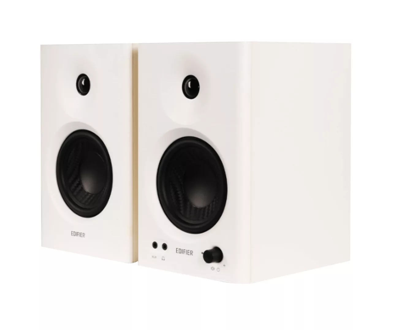 Gabinete de MDF de resonancia acústica Color: Blanco Potencia de salida: 21W + 21W RMS Frecuencia: 60 Hz - 20 kHz Relacion de ruido: +- 85 dB (A) Control de volumen independiente Gabinete de MDF Entradas de audio: TRS RCA AUX Conector de salida para auriculares Perilla multifuncional para alternar encendido, volumen y efectos de sonido. Modos de monitor y música para adaptarse a diversos escenarios.