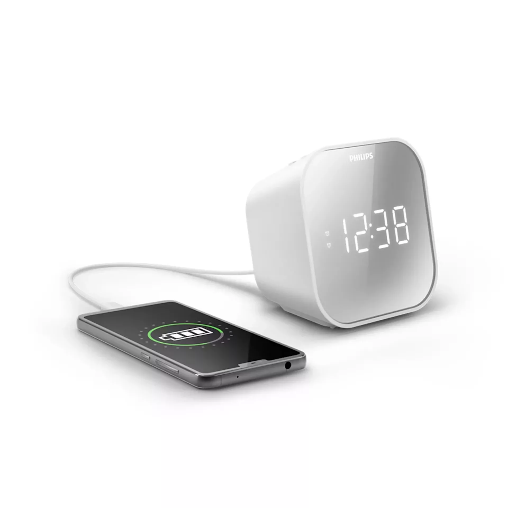 PHILIPS - RADIO RELOJTAR4406/37Levántate listo para rockear. Este radio reloj FM cargará su dispositivo móvil mientras duerme y lo despertará con un tono de alarma o una estación de radio que sube suavemente. También hay un temporizador para dormir, por lo que también puedes quedarte dormido escuchando la radio.Pantalla tipo espejo.Da la hora de un vistazo con este radio reloj despertador FM. Los dígitos grandes significan que la pantalla con acabado de espejo es fácil de ver y puede ajustar el brillo para que se adapte a su habitación. Los controles simples se encargan de configurar la alarma, el volumen y la sintonización.Carga tu teléfono.Un práctico puerto USB le permite usar la fuente de alimentación del radio reloj para cargar su teléfono mientras duerme. Este reloj despertador también tiene una batería de respaldo. Si hay un corte de energía, no tendrá que reiniciar el reloj y su alarma sonará a tiempo.Formato de Tiempo: 12 h, 24 h.Número de Alarmas: 2.Sintonizador Analógico: FM 87,5 - 108 MHz.Altavoz: 1,5''.Antena: FM.Potencia: 700 mW.Salida USB: 5 V, 1 A.Peso: 220 g APROX.Dimensiones: 110 x 110 x 75 mm APROX.Entrada: 100 - 240 V, 50 / 60 Hz.Consumo: