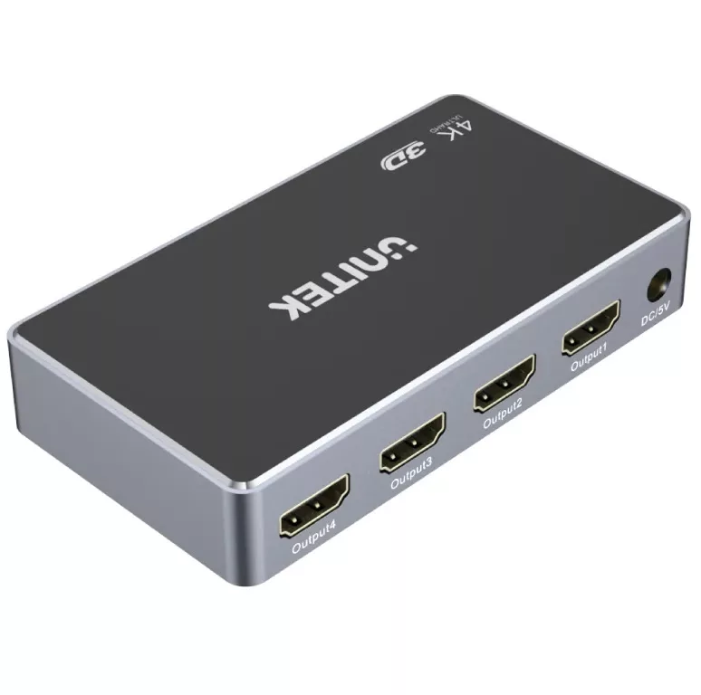1P entrada. 4P salida Conecta una fuente HDMI a 4 pantallas HDMI al mismo tiempo. Admite una resolución de hasta 4K30Hz (UHD) (3840 x 2160) y es compatible con 480p, 720p, 1080i, 1080p.* Compatible con HDMI 1.4b y HDCP 1.3. Admite profundidad de color de 12 bits y transferencia 3D. Compatible con Dolby TrueHD y DTS-HD para sonido envolvente digital 7.1 sin comprimir. LED del panel frontal para estado del puerto y de energía. Color: Gris espacial + negro Salida ascendente: 1 x HDMI Salida de bajada: 4 x HDMI Voltaje: 5 V/1 A CC Medidas del producto: 110 x 60 x 19,06 mm Medidas de CC: 5,5 x 2,1 mm