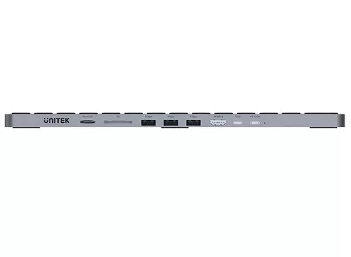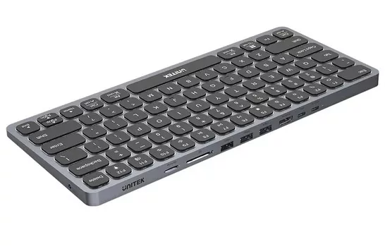 3 USB-A, 1 HDMI, 1 USB-C y más Teclado cableado con HUB USC-C 9 en 1 integrado. Puerto HDMI 4K, USB-C con 100W de PD, Lectores de memoria SD y más. Compatible con Windows, MacOS, y Linux. Cable de 60cm de largo. Construido en aleación de aluminio, color gris. Medidas: 296.4 x 127.4 x 13mm Puertos disponibles: 1 x HDMI 2.0 3 x USB-A 3.0 ports 1 x USB-C 3.2 (PD 100w, Pass-Through) 1 x USB-C host 1 x 3.5mm combo Audio/ Mic Jack 1 x SD Card reader 1 x Micro SD card reader