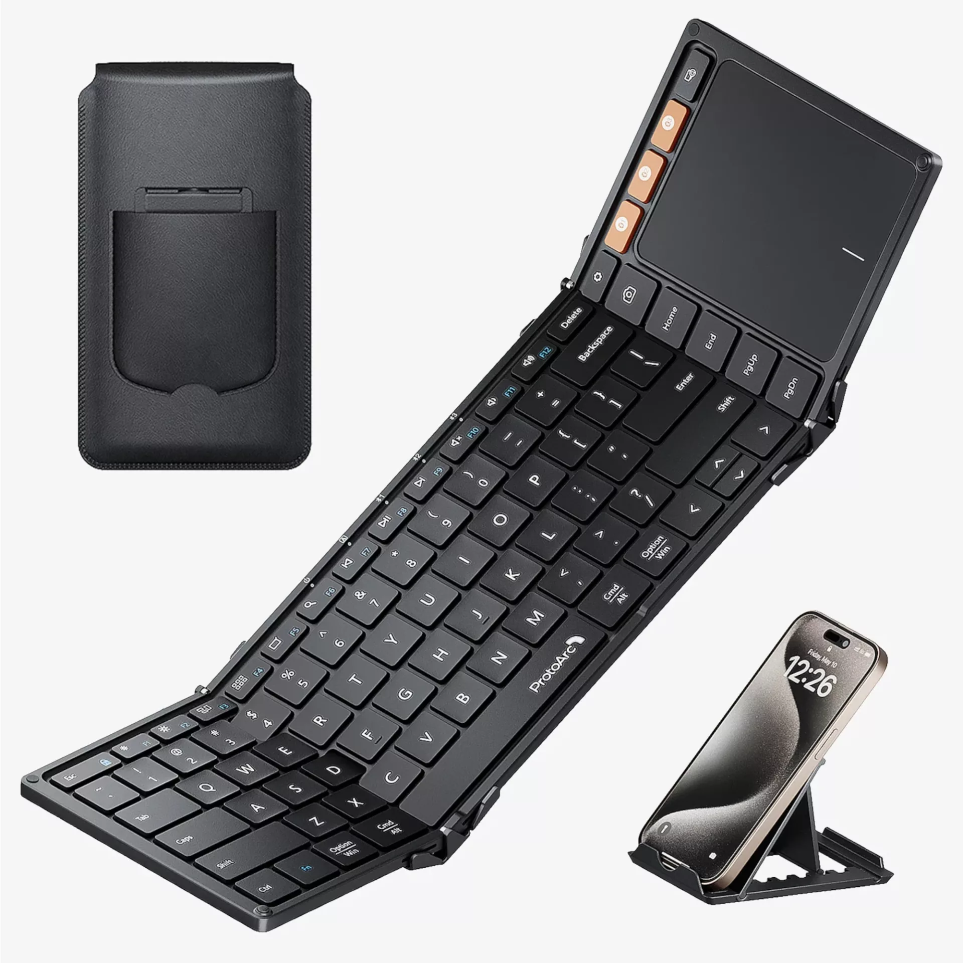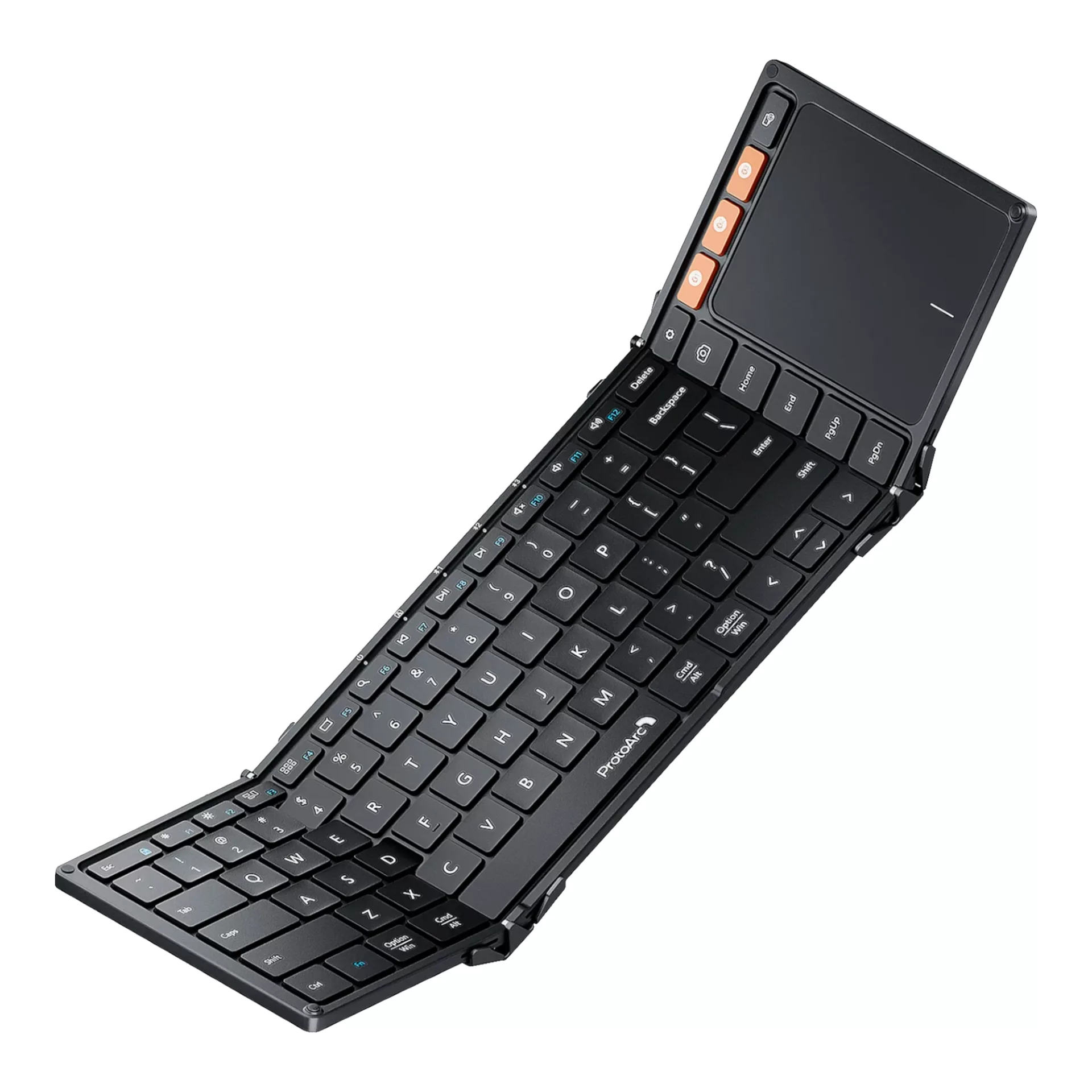 PROTOARC - TECLADO CON TOUCHPAD PLEGABLE BLUETOOTHXK01-TPIdeal para viajeros frecuentes!Diseño de tres pliegues.Diseño de tres pliegues, diseñado para soportar más de 100000 pliegues.Fácil de transportar.Puedes llevar este teclado plegable y liviano a todas partes sin problemas. Viene con un soporte para smartphone y una bolsa de cuero PU especialmente diseñada para este teclado. Perfecto para viajar!Diseño de disposición de 88 teclas + touchpad.Teclado QWERTY con touchpad y fila completa de teclas de acceso directo, permite escribir de manera rápida y precisa, lo que hace que el trabajo sea más ágil y productivo.Touchpad multitáctil.El touchpad multitáctil brinda una experiencia de uso cómoda al hacer click, desplazarse y deslizarse por el contenido sin esfuerzo.Conexión para tres dispositivos.Permite conectar hasta tres dispositivos a la vez mediante Bluetooth. Además cuenta con una amplia compatibilidad de dispositivos, ya que es compatible con Windows, Mac, iOS y Android.Suave y silencioso.La tecnología de interruptor de tijera garantiza pulsaciones de teclas silenciosas con rebote rápido, brindando una experiencia de escritura precisa y eficiente al tiempo que minimiza el ruido.TECLADO INGLÉS. SIN NÚMERICO. TOUCHPAD MULTITÁCTIL.TRIPLE PLIEGUE.CONECTIVIDAD: BLUETOOTH.Alcance INALÁMBRICO: 10 m APROX.Compatibilidad: WINDOWS / MAC / IOS / ANDROID.Peso: 297 g APROX.Dimensiones Expandido: 386,4 x 119,7 x 12,4 mm APROX.Dimensiones Plegado: 215,5 x 119,7 x 20,9 mm APROX.Batería: LI-PO 300 mAh.Color: NEGRO.INCLUYE: SOPORTE PARA SMARTPHONE x 1, BOLSA DE CUERO PU x 1.Link del Fabricante.Garantía: 1 año.Contra Defecto De Fabricación.